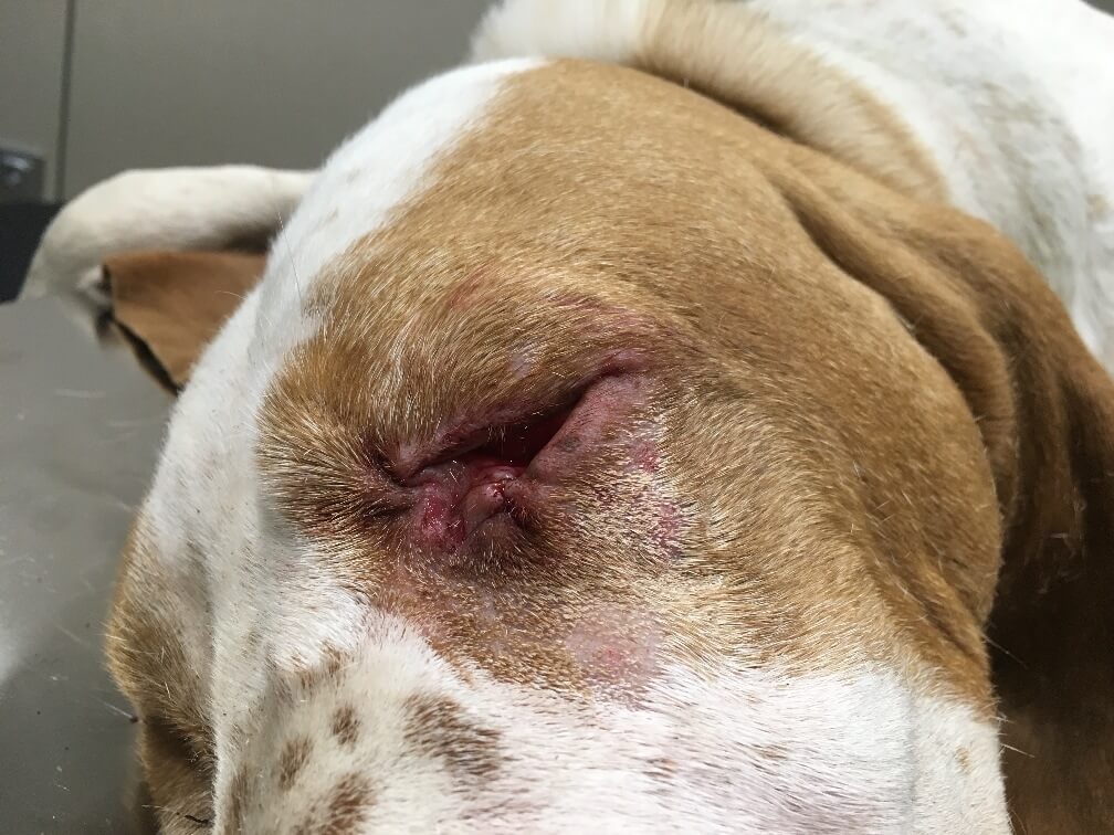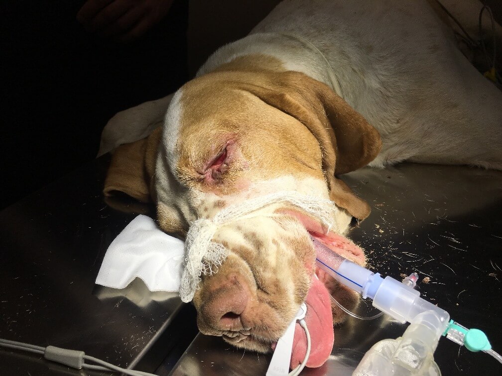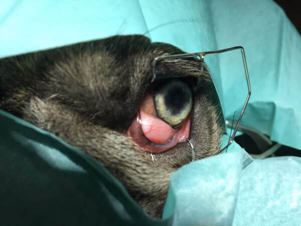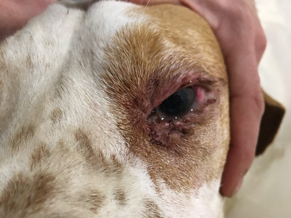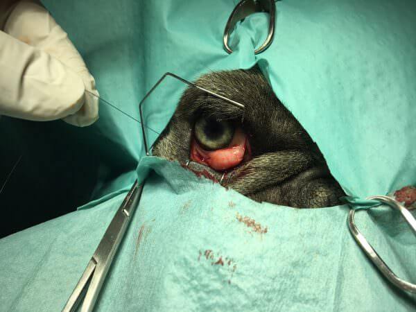 En segon lloc, et presentem a Joe, un Brac italià que es va presentar d’urgències a la nostra clínica veterinària a causa d’una ferida palpebral que havia afectat a diferents capes: la parpella, conjuntiva palpebral i part de la membrana nictitant. Les analítiques preoperatòries eren normals pel que es va realitzar la cirurgia oftalmológica amb el mínim risc. En aquest cas és important realitzar un patró de sutura amb punt en vuit per preservar la còrnia i no provocar úlceres traumàtiques iatrogèniques a causa del frec aquesta.