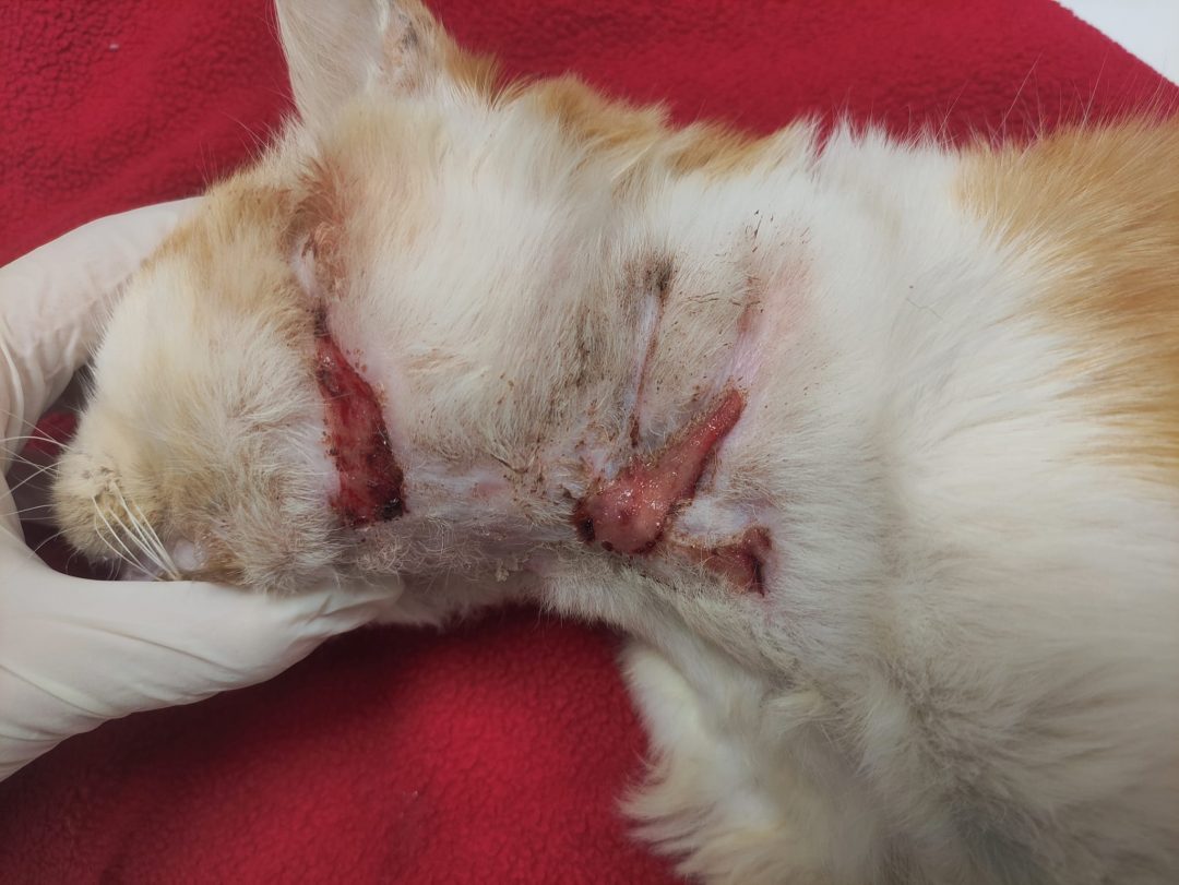 Nuestras veterinarias, Isabel Frías (medicina felina) y Araceli Calvo (cirugía y manejo de heridas) atendieron al paciente y conjuntamente decidieron realizar una biopsia de las lesiones por la cronicidad del cuadro además de una cura posterior.